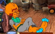 Joe Cluestoe is a furry, orange, skinny humanoid thing with bright blue eyes, an abnormally large cranium, and two elephantiastic feet each with three huge bulbous bright cyan toes. He also has thick reddish-orange hair in the form of two tufts on the sides of his head and a monobrow. He wears a light grey tunic with an emerald green strap tied around his waist.